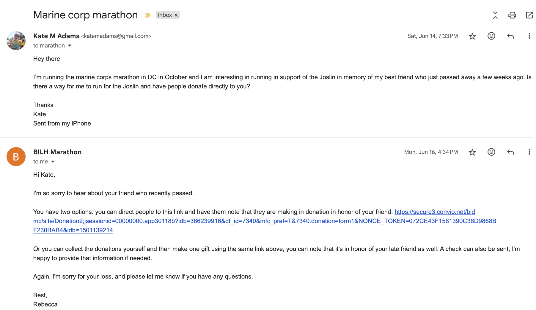 Then, the Monday after her funeral, I emailed Joslin to see if I could raise money for them—despite them not being an official Marine Corps Marathon partner. The woman who replied? Her name was Rebecca.
