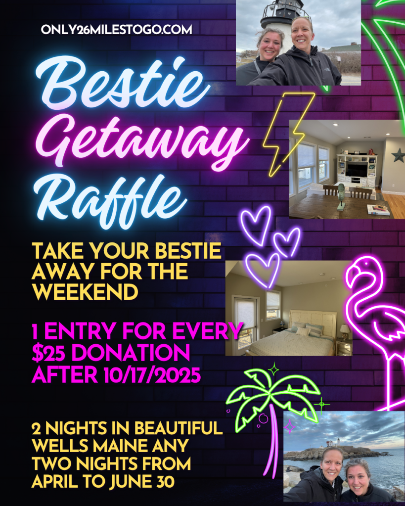 From now until October 27th, every $25 donation made to Only 26 Miles to Go earns you one entry to win a Weekend Bestie Getaway on the South Coast of Maine!